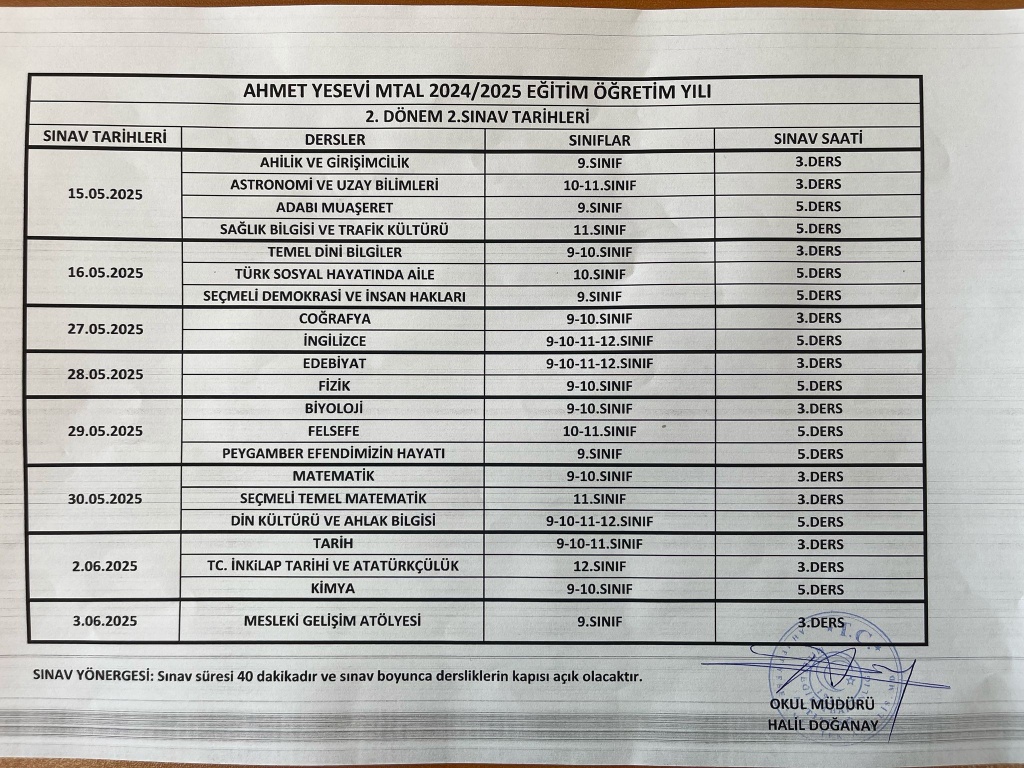2024-2025 Eğitim ve öğretim Yılı 2. dönem 2. Ortak Yazılı Sınav Takvimidir. Sınava girecek öğrencilerimize başarılar dileriz.
